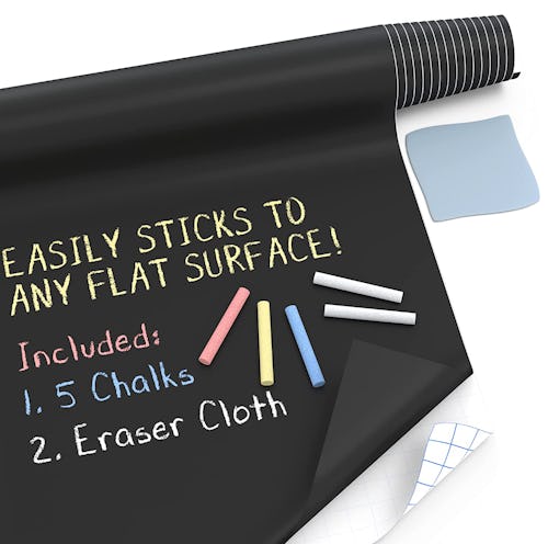 Transform any flat surface into a creative canvas with this chalkboard wallpaper. Each roll provides ample space for your ideas, and it comes with five vibrant chalk colors for maximum creativity. Made from durable, water-resistant material, it's easily customized with a pair of scissors to fit any space.