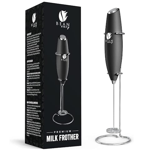 Bean Envy Handheld Milk Frother for Coffee - Electric Hand Blender, Mini Drink Mixer Whisk & Coffee Foamer Wand w/Stand for Lattes, Matcha and Hot Chocolate - Kitchen Gifts - Black