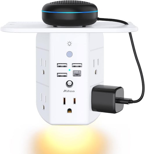 Boost the functionality of any wall socket with this nine-in-one wall outlet extender. This space-saving device not only triples your outlet capacity but also adds convenience with five USB outlets, three USB ports, and a USB-C port all in one convenient place. It features a soft, smart LED night light and a detachable shelf to hold charging devices. It also has a surge protector to safeguard your valuable electronics from unexpected power surges.