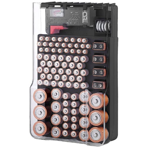 Never be caught powerless again with this battery organizer case. Designed to neatly store and organize up to 93 batteries of various sizes, it works in any home, kitchen, garage, or workspace. The clear, hinged lid allows for quick identification and inventory management, ensuring you always know what you have and what you need. Plus, with the included removable battery tester, you'll be able to know which batteries are usable and which are dead.