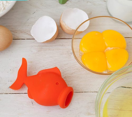 A squeezable egg separator that looks like a fish
