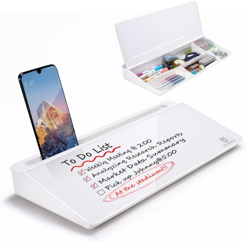 This desktop whiteboard will be useful for making to-do lists, jotting down notes, and more — and as a bonus, it has hidden storage for smaller accessories like pens, tape, paper clips, and markers. The glass writing surface is angled for comfortable use and has a slot at the top to prop up a tablet or phone.