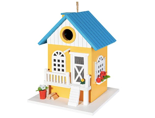 Add some life and birdsong to your garden with this colorful birdhouse. Hang the house up and place a few seeds on its front “lawn” to let the birds know that it’s a safe space.