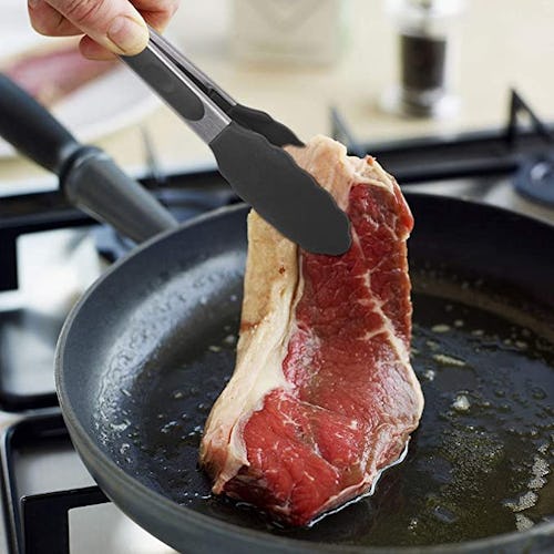 These stainless steel tongs are designed with silicone tips that won’t damage your pots and pans and silicone grips that make them easy to handle and slip-free. They’re heat resistant up to 600 degrees. Plus, they’re made with a spring mechanism that allows the tongs to stay open until you squeeze them. The best feature has to be the locking system. Unlike similar tongs, that stay open and therefore are difficult to store, these feature a ring-pull that allows you to lock them in a closed position when they’re not in use.