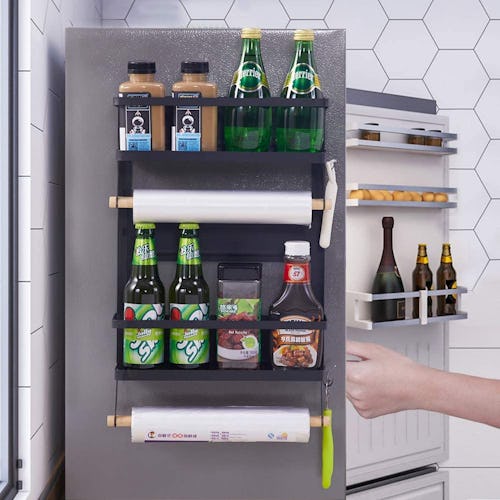 Take advantage of that otherwise useless space on the side of the fridge by sticking this magnetic fridge organizer to it. Now you have four tiers of shelving and storage that can hold everything from spices to oils to cling wraps to paper towels. The grey color blends in and the magnetic grip is strong enough to support up to 45 pounds.