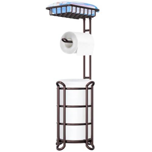 Drop this toilet paper holder stand anywhere in the bathroom and stop worrying that you don’t have the perfect place to mount the TP to the wall. It looks elegant while dispensing one roll of toilet paper and storing three more. A shelf on the top is the perfect spot to drop your phone or store some wipes.