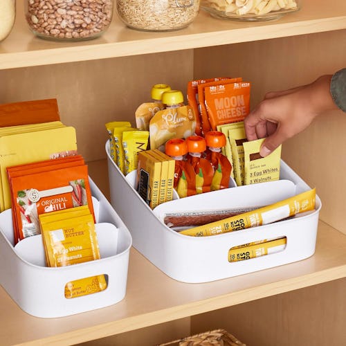 All those snack bags, breakfast bars, and packet foods are difficult to store. This adjustable snack bin creates order out of that chaos so you can find what you want and easily put your just-purchased snacks away. The two dividers are moveable so you can build a solution for the snacks you like.