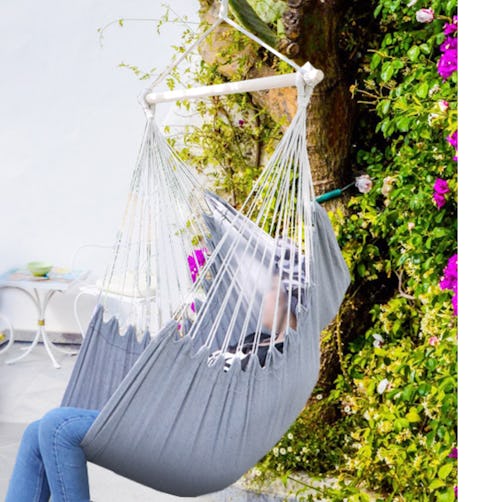 If you don’t have space on your patio for a hammock, consider opting for this hammock chair instead. It’s made from a soft, breathable cotton blend, with strong stitching that allows it to hold up to 330 pounds. Plus, the wooden pole at the top helps keep it from tipping over if you happen to lean too far forwards.