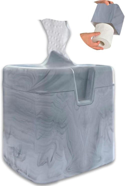 This tissue caddy allows you to save money on tissue boxes and wipe your nose with budget-friendly toilet paper instead. The box is designed with two grooves on which to place the included roller with an opening at the top that allows you to tear off just the amount you need. Made of plastic, it features a gray granite finish that will fit seamlessly in a range of interiors.