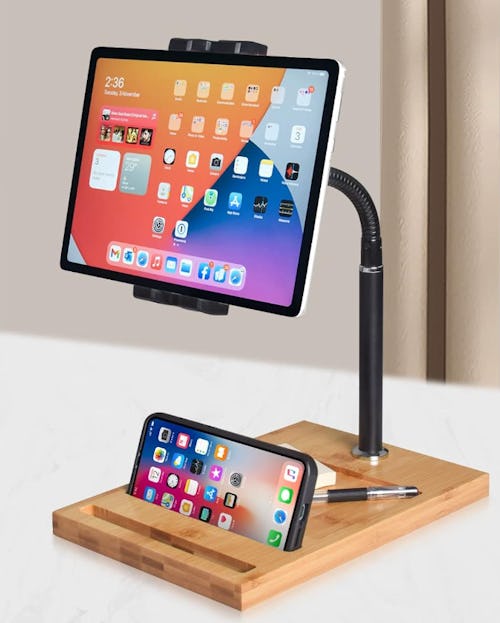 Keep all your devices in one convenient location with this tablet stand holder. Made of real wood, it features a clamp that can accommodate any device from 4.7 to 12.9 inches. The base has two slots to easily display phones and provide space for pens, pencils, and notepaper. The tablet can be rotated vertically or horizontally to suit your needs with a flexible gooseneck to get the viewing angle just right.