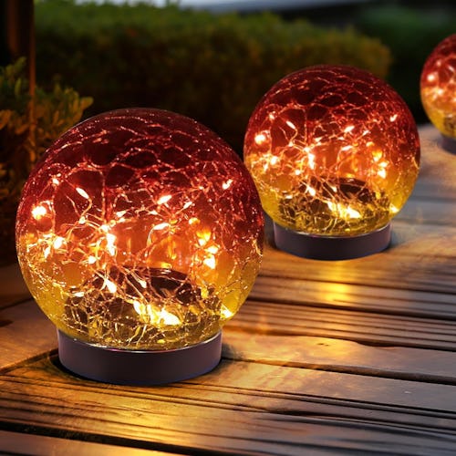 These solar globe lights feature a cracked glass design and are great for adding a bit of visual interest to your yard. They’re offered in either a gradient red, a multicolor, or a warm white option and charge via a built-in solar panel to turn on automatically at night. Stick them in your soil or lawn using the provided spikes or place them on your pavers for stylish nighttime lighting.