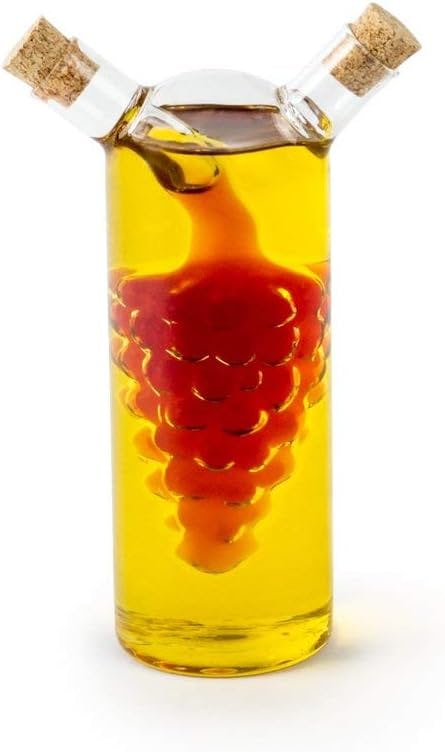 This cruet bottle is designed to keep oil and vinegar separated. It’s made of borosilicate glass, and it has two spouts with cork stoppers so each liquid can be dispensed individually. It’s designed with a unique grape motif inside the bottle that stands out when both liquids are different colors. It can also be used for salad dressings, infused oils, and more.