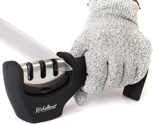 This versatile knife sharpener has three different types of blades to repair, sharpen, and polish dull and damaged utensils. The sharpener features a nonslip base and an ergonomic handle to keep things from moving around. The sharpener also comes with a cut-resistant glove for additional protection.