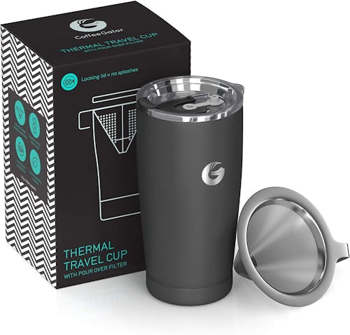 Save time and money with this clever travel mug that comes with a mini pour-over coffee filter. The 20-ounce mug is vacuum-insulated and can keep drinks cold for 20+ hours and hot for over six hours. In addition to a leakproof lid, the mug also features a stainless steel filter. Add your coffee grounds, pour hot water over them, remove the filter, and you’ve got the perfect cup of freshly brewed java.
