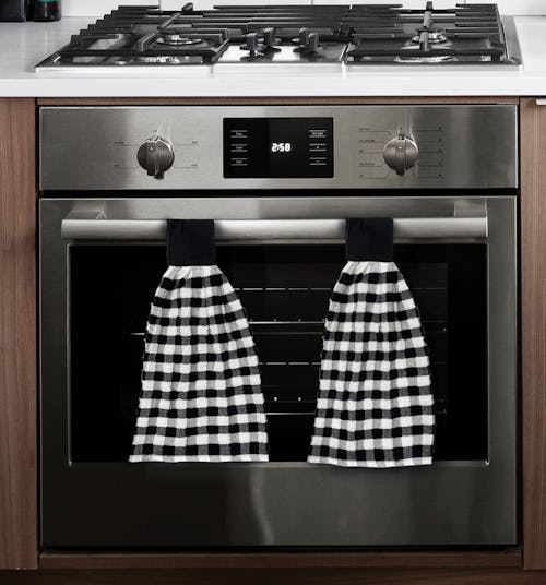 If your kitchen towels are constantly falling onto the floor, don’t fret, these towels feature a hook-and-loop closure that latches onto your oven, microwave, or cabinet handle to keep them off the floor and ready for use. They’re made of 100% cotton, so they’re super absorbent and dry quickly.