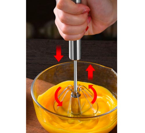 This stainless steel whisk has a game-changing design that spins when you press down on it. AKA — you can skip hand whisking and avoid using a bulky electric mixer for every recipe. This budget-friendly whisk is also surprisingly quick for being completely battery-free.