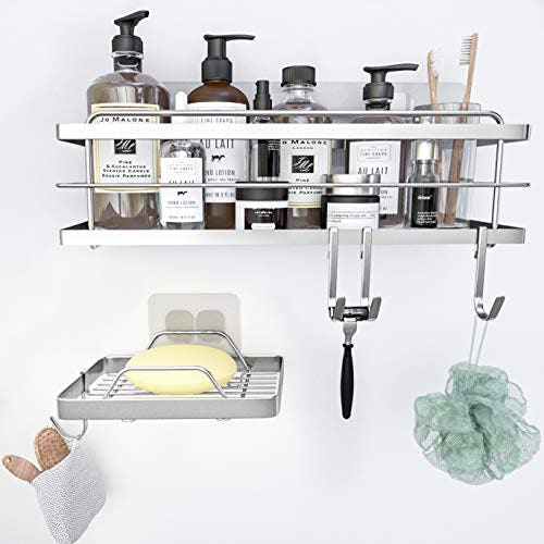 This minimalist-chic shower caddy set is perfect for holding all your shower supplies, including shampoo, face scrub, body wash, and soap. It comes with a large, stainless steel main caddy with a weight-bearing capacity of 20 pounds, plus a separate rotating soap dish, as well as four razor/loofah hooks. With ultra-strong adhesive that mounts in seconds, this is an easy bathroom upgrade.