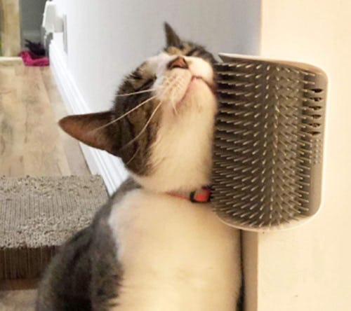 This self-grooming brush snaps onto the corner of your wall, chair legs, dresser or bookshelf bottom — you name it — to gently remove and collect your pet’s loose hair while massaging and grooming. It has a center compartment to fill with catnip to make it more attractive and stimulating, and it can be moved around to different furniture as much as you’d like.