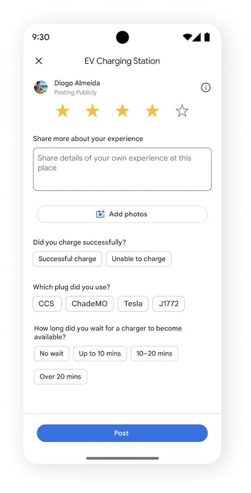 However, because the mobile version of Google Maps can’t connect directly to an EV, it isn’t able to collect any information on battery levels or usage. As a result, it can’t accurately add charging stops to any trips.