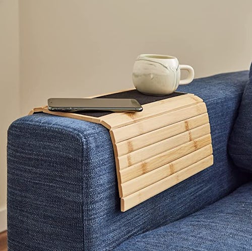 Instantly morph the side of your couch into a mini coffee table with this sofa arm tray. Perfect for glasses of wine, cups of tea, remote controls, and even small dishes, the clever living room accessory features sturdy bamboo slats that fold around the contours of your couch arm, with a grippy velvet material to help keep items in place. Plus, it comes in three finishes so it won’t clash with your space.