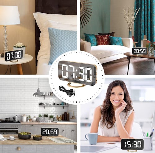 With its chic gold stand and reflective surface that functions as a mirror when the time display is off, this digital alarm clock is much more elevated than your standard option. It also has three brightness settings, a snooze button, and dual USB ports so you can charge your devices.