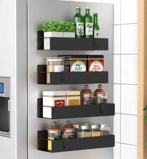 Rather than taking up space on the kitchen counter or in a cabinet, use these magnetic spice racks to store your frequently used herbs on the side of your fridge. Capable of holding up to 8 pounds, the heavy-duty magnetic shelves offer a perfect way to store your spices and other cooking essentials without a hassle. Plus, their impermanent design means that it will be easy to move them around if you want to rearrange things.