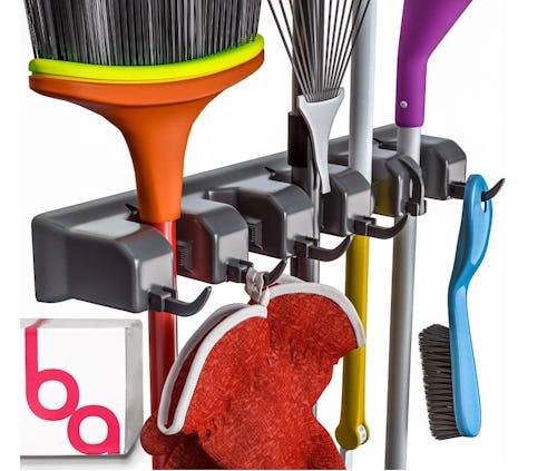 Get tools, sports equipment, and cleaning supplies organized and off the ground with this wall-mounted holder. The wall-mounted rack features six hooks and five spring-loaded clamps. Plus, it has a 35-pound capacity and comes with all the necessary (and super easy) mounting hardware.