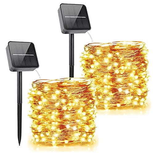 MUMUXI 2 Pack 33Ft 100 LED Solar String Lights Outdoor Fairy Lights Solar Powered with 8 Lighting Modes Waterproof Copper Wire Twinkle Lights for Patio Yard Trees Christmas Wedding Party, Warm White
