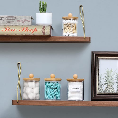Store everything from cotton balls to floss picks in these super stylish apothecary jars to turn them from an eyesore to an adorable bathroom accessory. They have a clear, plastic base and a stylish bamboo lid with a cute, round handle that’s easy to grab. Plus they come with six white labels and six transparent labels for even more organization.