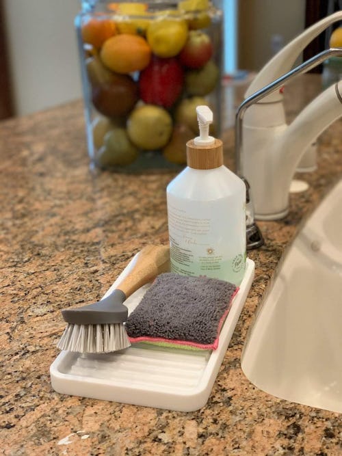 Place your sponge, dish brush, soaps, and more on top of this silicone tray to keep water, soap scum, and grime from building up or staining your counters. It has a textured, ribbed base to elevate your items from any excess water. Plus, it’s heat-resistant up to 450 degrees so it can also act as a trivet.