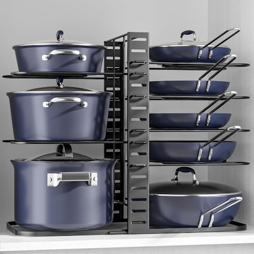 This best-selling organizer comes with six racks you can adjust to size so you can stack your pots and pans in a way that keeps them safe from scratches and easy to grab whenever you need them. It can be used with two sides vertically or one side horizontally, and it can also be used to store lids to keep them from falling out every time you open the cabinet.