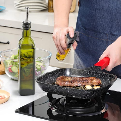 Putting your go-to cooking oils in one of these pretty dispensers instead of keeping it in the original packaging is a great way to level up your kitchen. The green glass bottle holds up to 17 ounces of oil and comes with two spouts — a snap lid top and a pourer with a rubber cap. The smaller misting bottle holds 3.6 ounces of oil and has a dustproof nozzle, which is much more attractive than an aerosol can.