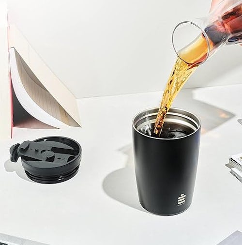 Take your coffee to go in this thermal coffee mug that feels good in your hand, is easy to sip from, and keeps your beverage hot or cold for hours. The flip-top lid makes it easy to close up for leak-free travel and snap open again to sip. It comes in two sizes and five colors.
