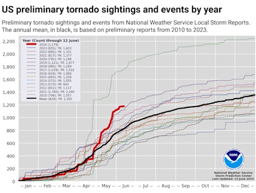 More than 1,100 tornadoes were reported through May — a preliminary number but nearly twice the 30-year average at that point and behind only 2011, when deadly tornado outbreaks tore across the southeastern U.S.