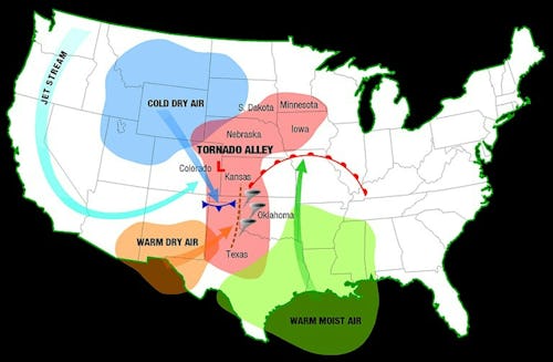 The expected decline in the number of tornadoes in the Plains is likely related to increasing heat over the high ground of the desert Southwest and Mexico. That heat flows over the Great Plains a few thousand feet above ground, creating a cap or lid. The cap lets heat and moisture build-up until it punches through to form a thunderstorm. This hot, moist air is why the central U.S. is home to the most violent tornadoes on Earth.
