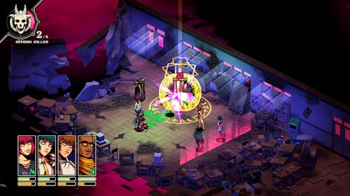 Once you’ve spent all your AP, sit back and watch as your entire team executes its attacks at once in a spectacular ballet of punches and magical spells. It’s a thrill to watch your carefully planned moves play out, but I did run into some quirks in the demo. In one battle, I had Knute knock a TV into a demon to deflect its attack, then Faye moved in for the finishing blow. But when the game played out my moves, Faye acted first, blocking the path of the TV and negating that damage.
