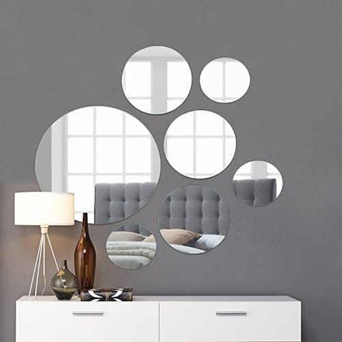 Enhance any wall and open up your space with this set of seven round wall mirrors. Made from glass, the set includes one large 10-inch mirror, three medium 7-inch mirrors, and three small 4-inch mirrors. Arrange them together for a captivating collage or separately for a custom look. Each set includes strong double-sided hanging tape for wall installation and foam stands for using the mirrors as centerpieces or candle plates.