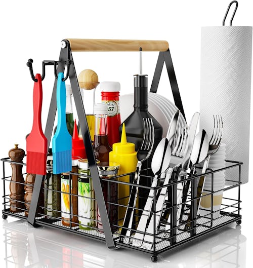 Upgrade your outdoor grilling experience with this heavy-duty grill caddy. With a side paper towel holder, this caddy offers six spacious compartments and three hanging hooks, great for organizing spices, utensils, and more. Made from durable steel, the inverted triangle guardrail design can support large dinner plates without tilting, and its smooth wooden handle makes it easy to carry.