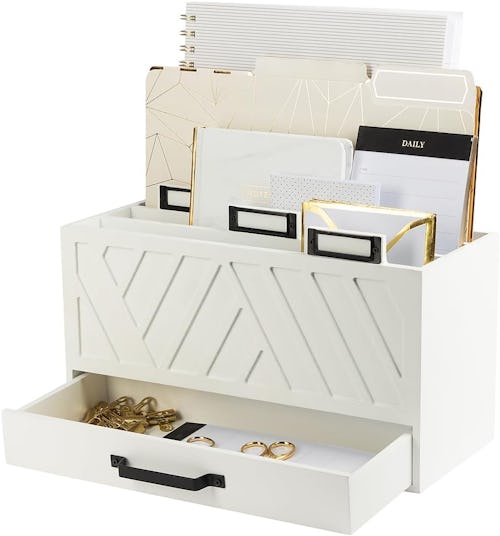 Wondering how to declutter your desk or home office? This modern large folder organizer and mail sorter is a chic solution. Crafted from sturdy wood, this desk organizer fits papers and file folders horizontally, providing easy access and neat storage. Plus, it includes a handy drawer for pens, stamps, and other essentials.