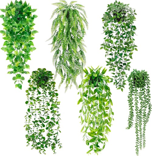 No green thumb, no problem: Add some nature to your space with this pack of six artificial hanging plants in an array of styles. Ideal for indoor decor, these plants bring nature indoors without taking up table space. Hang them on walls, doors, banisters, and more for a sophisticated look.