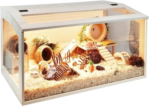 Measuring 24 x 16 x 16 inches, this cage features an openable top with transparent acrylic sheets for easy observation and interaction. It is constructed from high-density natural wood with a corrosion-resistant and waterproof coating, ensuring durability and ease of cleaning. Vents on the top provide proper air circulation. Perfect for creating an interactive environment, it supports natural behaviors such as digging and exploring.