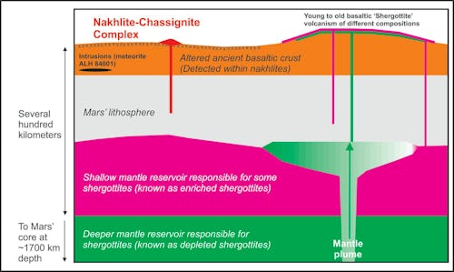 Shergottites come from at least two sources within Mars. They may come from parts of the mantle just beneath the lithosphere or even the deep mantle, which is closer to the planet’s metallic core.
