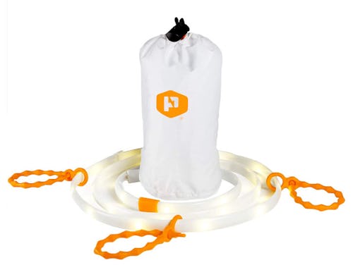 This clever LED light rope in a bag is the perfect lighting solution for camping and so many other things. Attach the rope to the tent. Mount it to a tree. Or carry the bag as a lantern. It has built-in magnets that make mounting it easy and it comes with noodle ties and a remote control.
