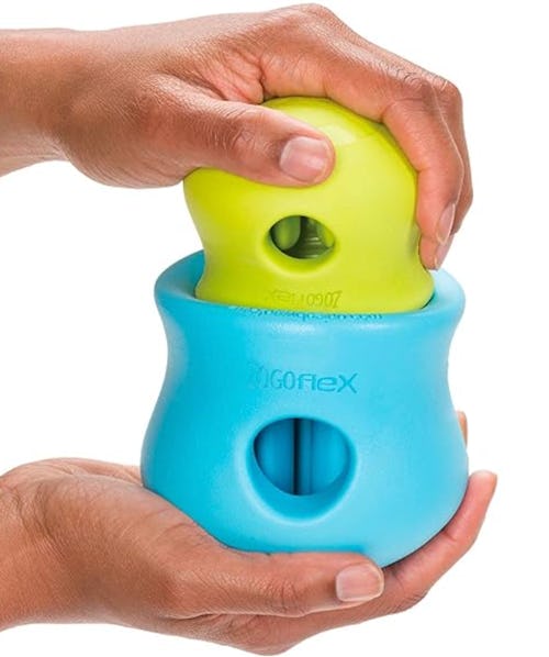Load this dog toy puzzle with treats and let your pup spend the day trying to solve it to get those tasty snacks out of the toy and into their tummy. It’s fun to chase, chew, and play with, and — eventually — the prize is worth it. It’s a great way to slow fast eaters down, too. It comes in three sizes and three colors.