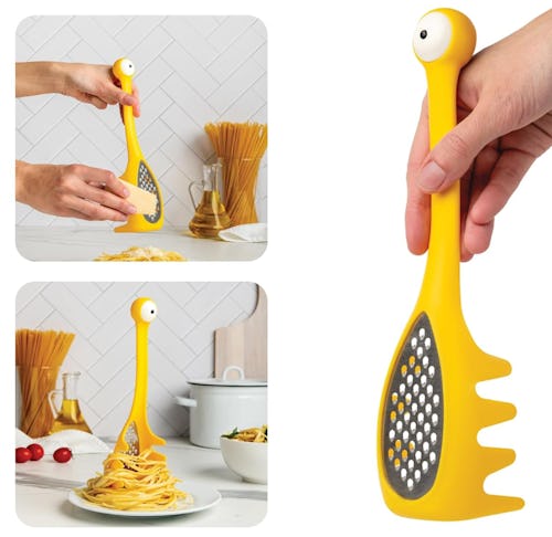 This adorable pasta spoon and cheese grater is everything you need for pasta night. It’s a cute kitchen companion that looks like a one-eyed monster. It helps you swirl spaghetti so you can serve a delicious dollop onto your plate. And then it grates the cheese.