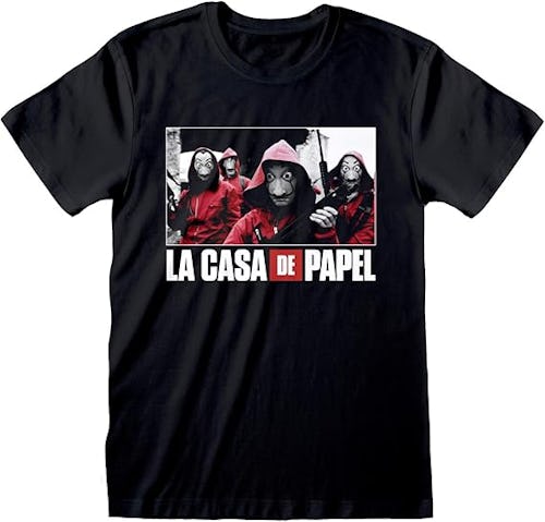 This shirt, available in sizes ranging from S to 5XL, features a striking group photo of the show's iconic characters, including the mastermind Professor and his team of skilled robbers. The design captures the essence of the hit series, known for its high-stakes heists and complex characters.