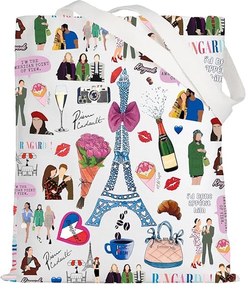 Featuring a design that highlights the Eiffel Tower, this tote bag is perfect for fans of Emily and Mindy. Its stylish look makes it a great gift for those who love the show's Parisian backdrop. Ideal for carrying your essentials while showcasing your appreciation for the series, this shoulder bag combines practicality with a touch of Emily’s Parisian flair.