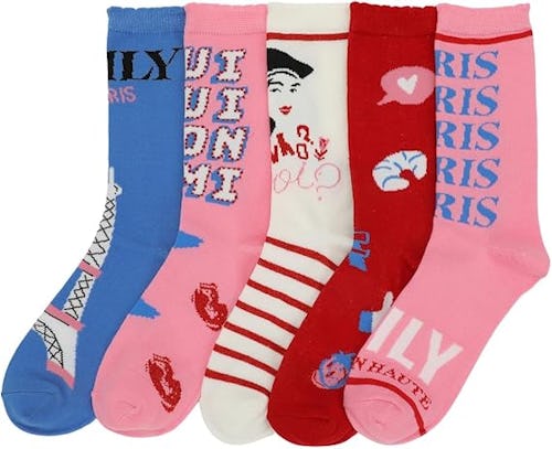 This 5-pack brings a touch of Parisian charm to your everyday attire, with each pair reflecting the show’s iconic style. From scalloped cuff edges to subtle Lurex yarn accents, these socks capture the sophisticated flair seen in Emily's stylish escapades around Paris. Made from a comfy blend of polyester and spandex, they promise a snug, stretchy fit that keeps you feeling chic from dawn till dusk. Officially licensed, they fit a range of sizes and are easy to care for—just machine wash cold and tumble dry low.