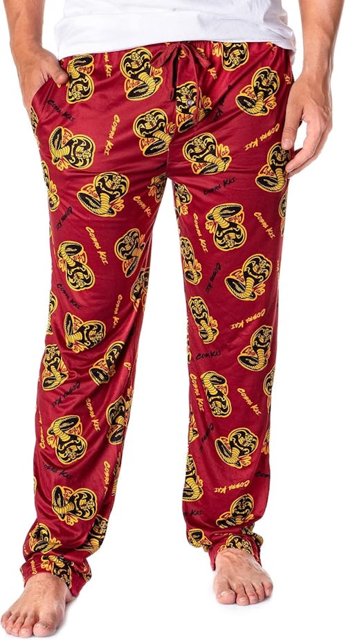 These Cobra Kai pajama pants are designed with comfort in mind and feature an allover Cobra logo pattern. Made from a soft and breathable polyester blend, they are a great choice for both lounging and sleeping. The pants have a relaxed fit, with an elastic waistband and adjustable drawstring to ensure a secure fit. They are also easy to care for, retaining their color and softness after washing. Available in various sizes, these pajama pants are a practical option for fans of the series.