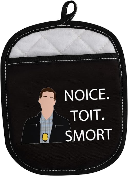 Featuring the iconic "Noice, Toit, Smort" catchphrase from Jake Peralta, these oven mitts are a perfect gift for any fan of the beloved TV show. Made from durable, heat-resistant materials, they offer both protection and a playful nod to your favorite detective squad. Ideal for Brooklyn Nine-Nine enthusiasts who enjoy baking or cooking with a side of comedy, these mitts add a fun and functional flair to any kitchen.